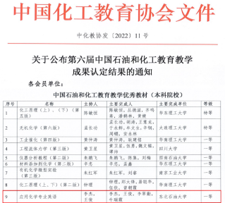(通讯员 牛瑞霞)近日,由中国化工教育协会开展的第六届中国石油和化工教育教学成果奖评选结果揭晓,我院李杰副教授、王俊教授主编的《应用化学专业英语》获评优秀教材(本科院校)一等奖,这是我院首次获得中国化工教育协会教材类成果奖项。