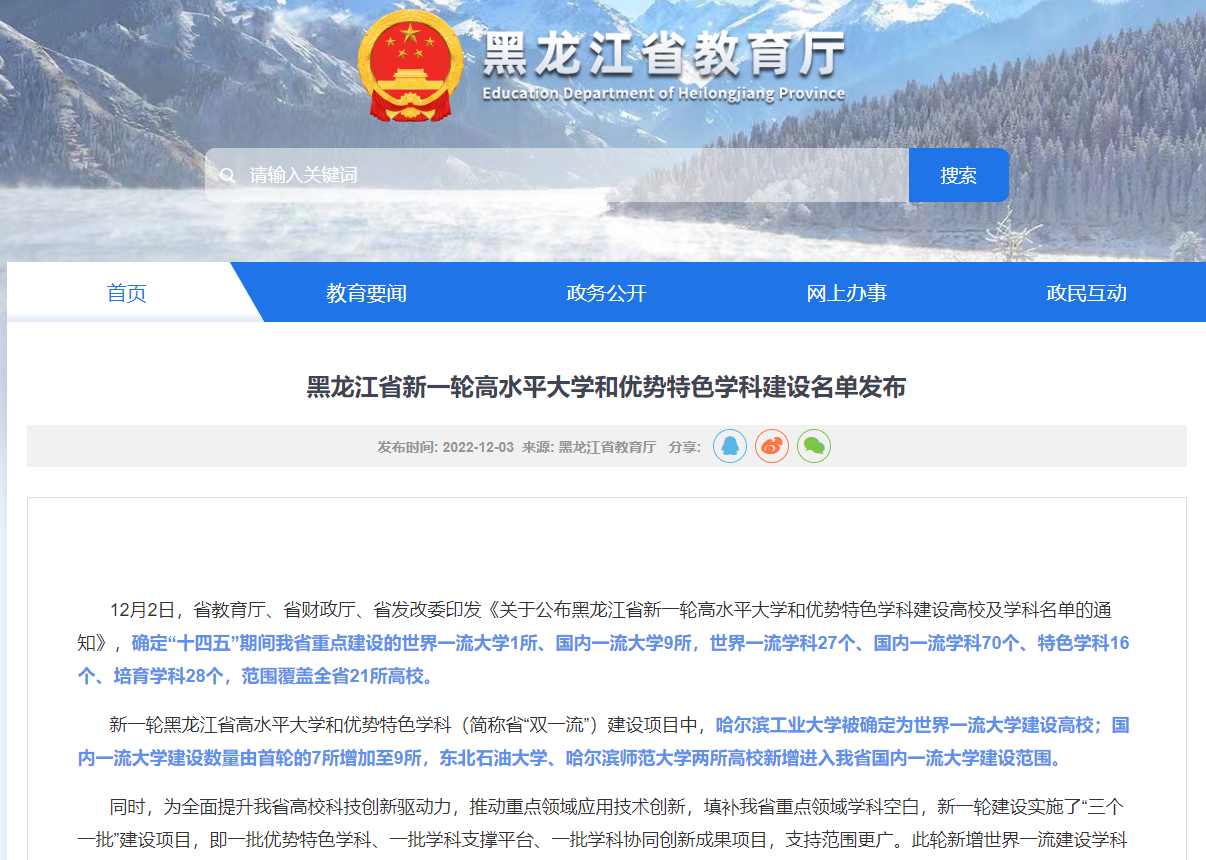 (黑龙江省新一轮高水平大学和优势特色学科建设名单发布)