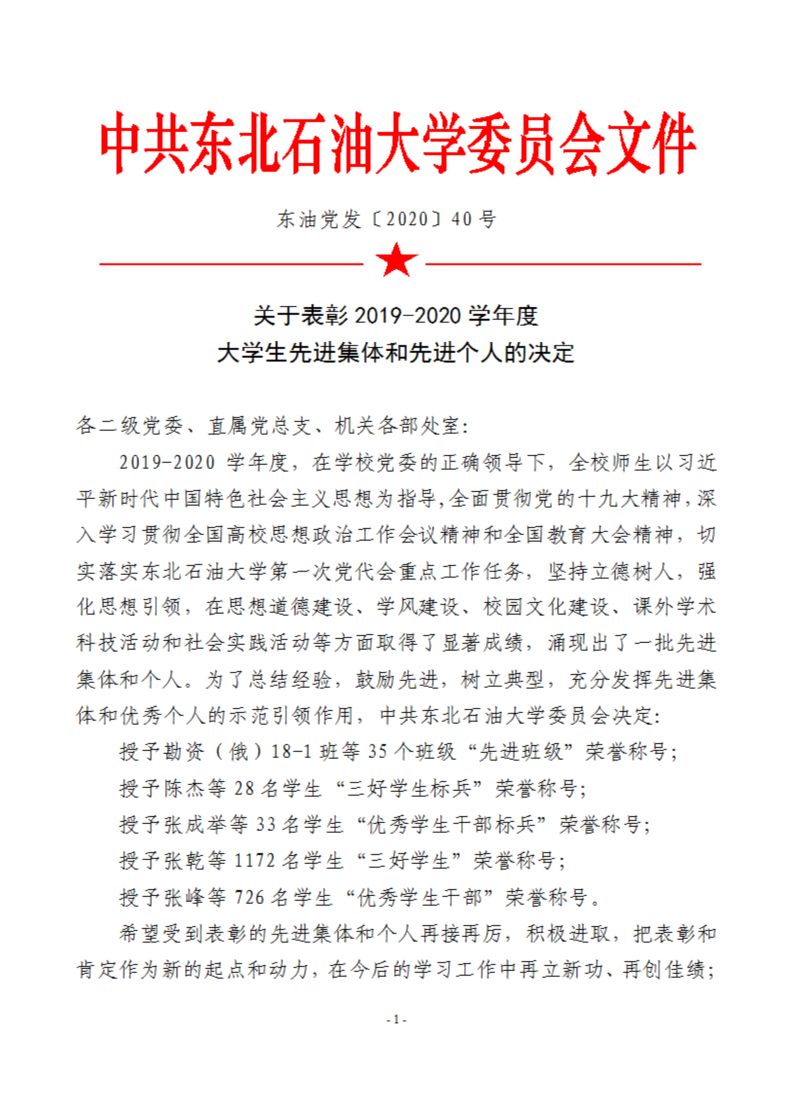 关于表彰2019-2020学年度大学生先进集体和先进个人的决定